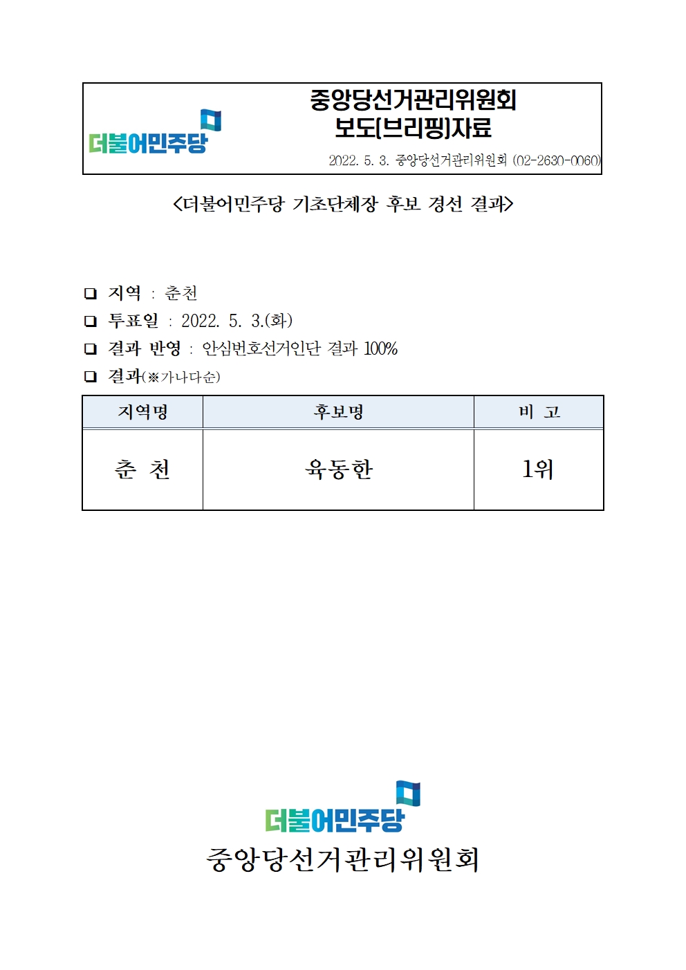 [보도자료] 더불어민주당 기초단체장 후보 경선 결과(춘천)