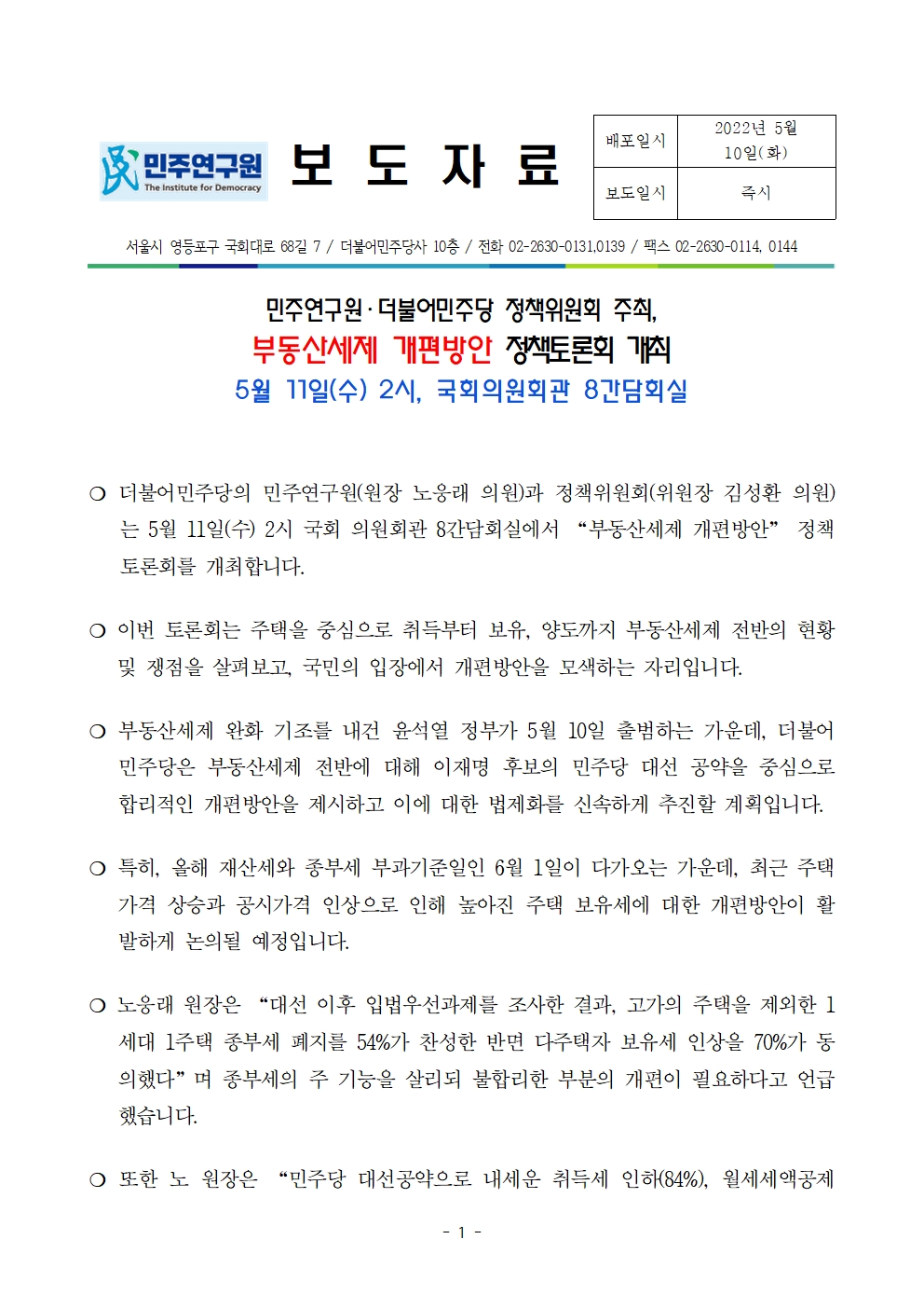 [보도자료] 더불어민주당 민주연구원-정책위원회 주최 부동산 세제 개편방안 정책토론회 개최