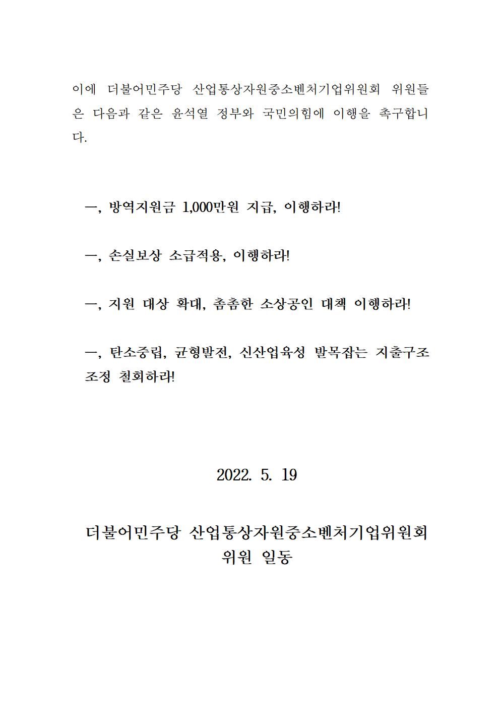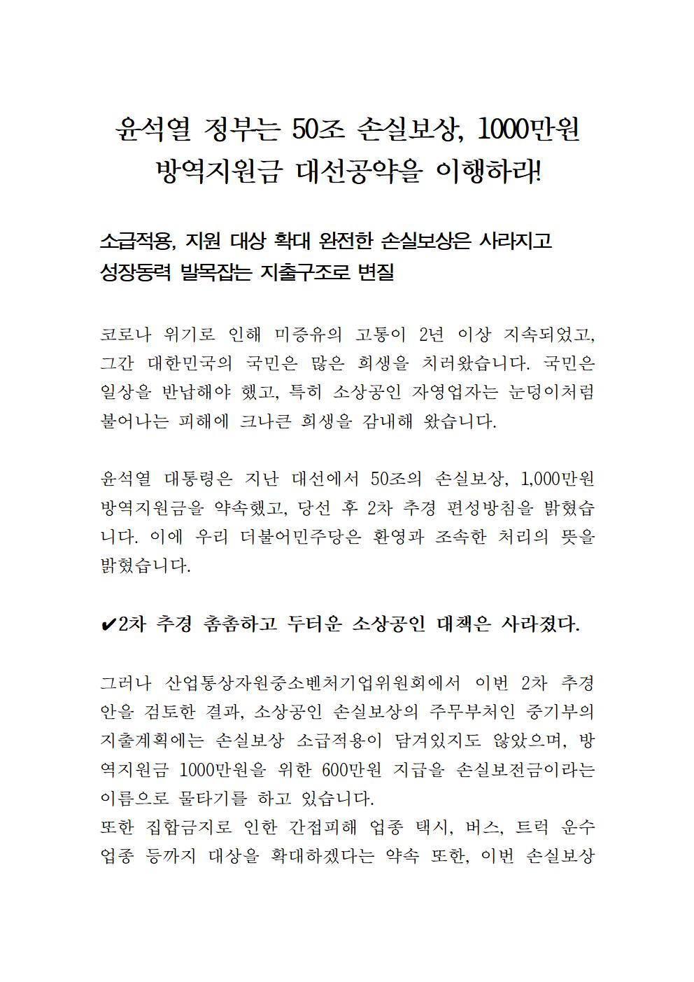 [기자회견문] 더불어민주당 산자중기위원, 윤석열 정부는 50조 손실보상, 1000만원 방역지원금 대선공약을 이행하라!