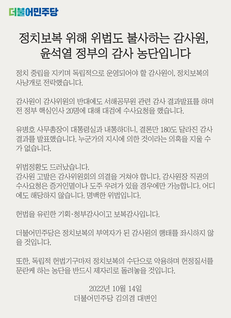 정치보복 위해 위법도 불사하는 감사원, 윤석열 정부의 감사 농단입니다