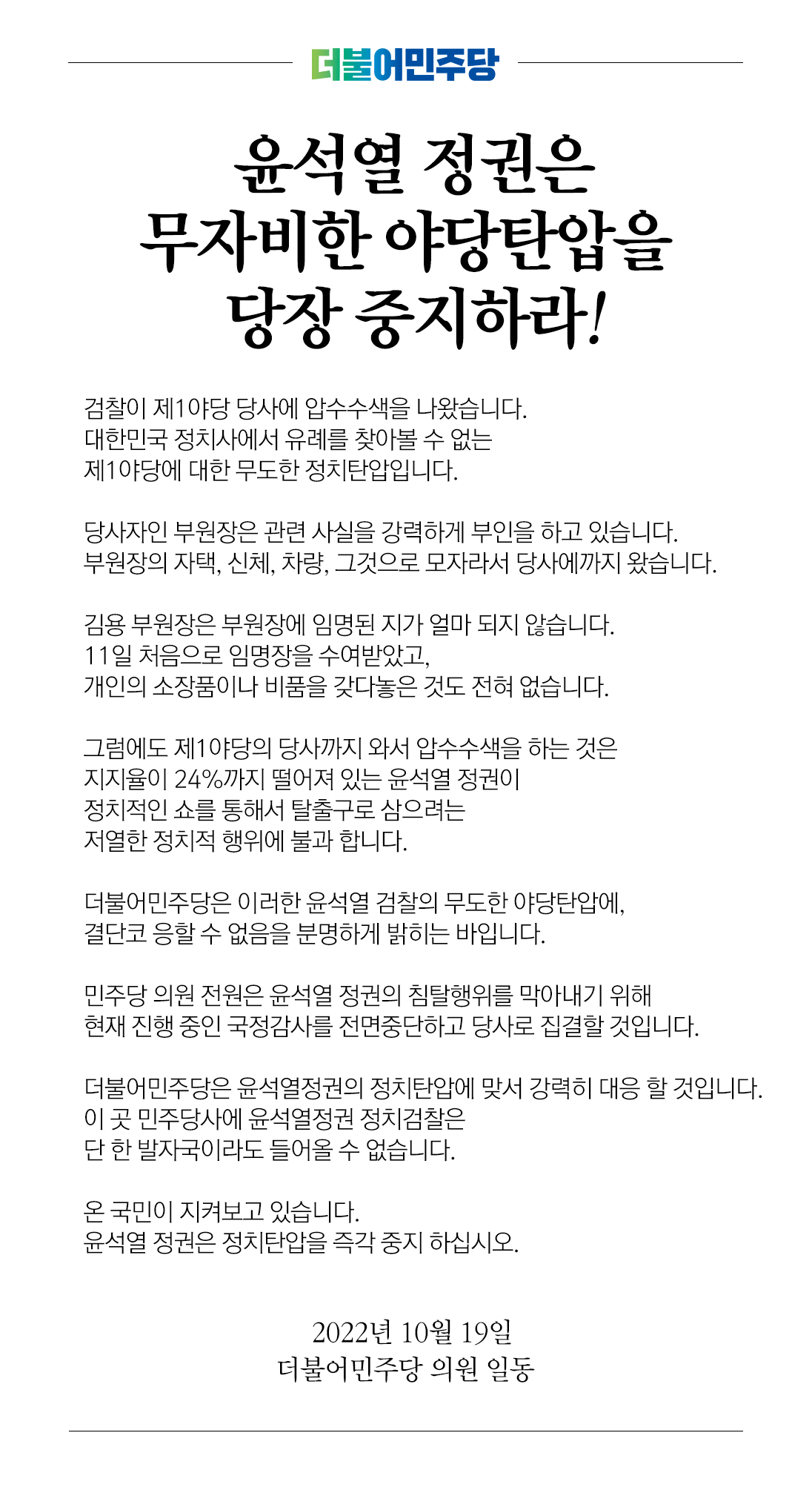 제1야당 당사에 대한 압수수색은 유례없는 정치탄압입니다