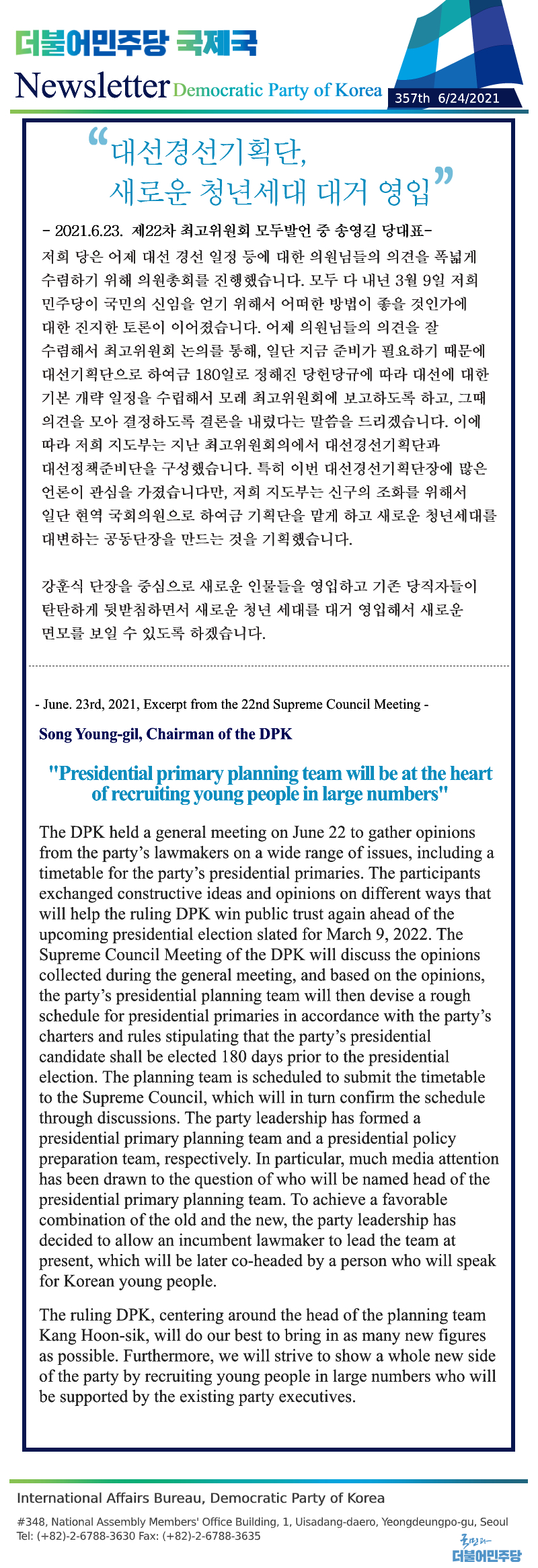 [356th Newsletter]Address Delivered by DPK Chairman Song Young-gil to the Parliamentary Negotiation