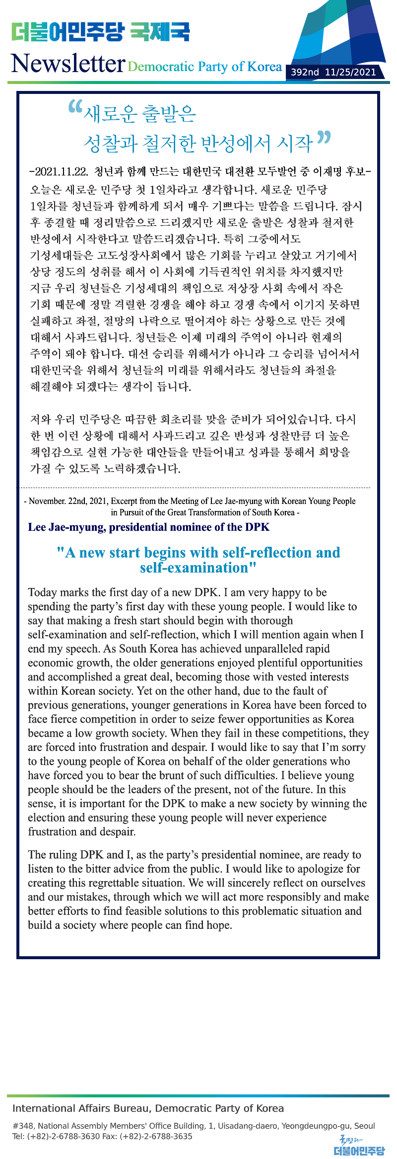 [392nd Newsletter]Excerpt from the Meeting of Lee Jae-myung with Korean Young People