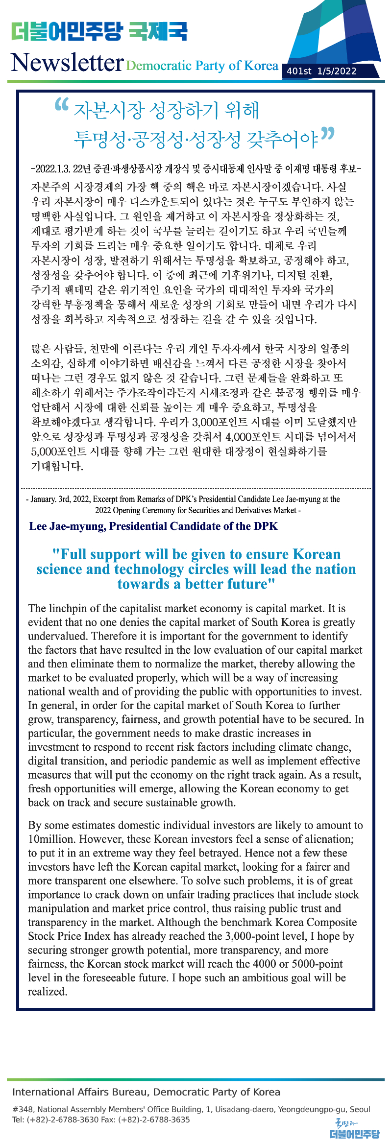 [401st Newsletter]Excerpt from Remarks of DPK’s Presidential Candidate Lee Jae-myung at the 2022 Ope