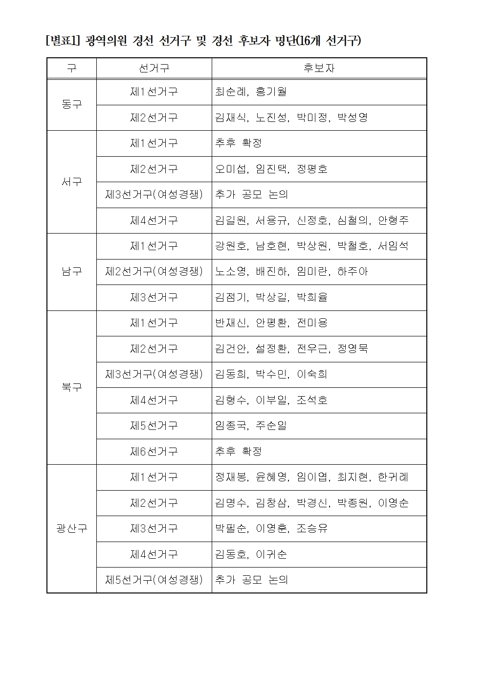 광역의원 및 기초의원 경선 선거구와 경선 후보자 명단은 별표와 같다.